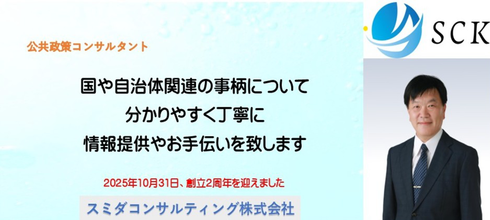 スミダコンサルティング株式会社は、公共政策に精通した元官僚炭田寛祈が国や自治体の政策や補助金、制度などに関し、丁寧に情報提供やお手伝いを行う会社です。